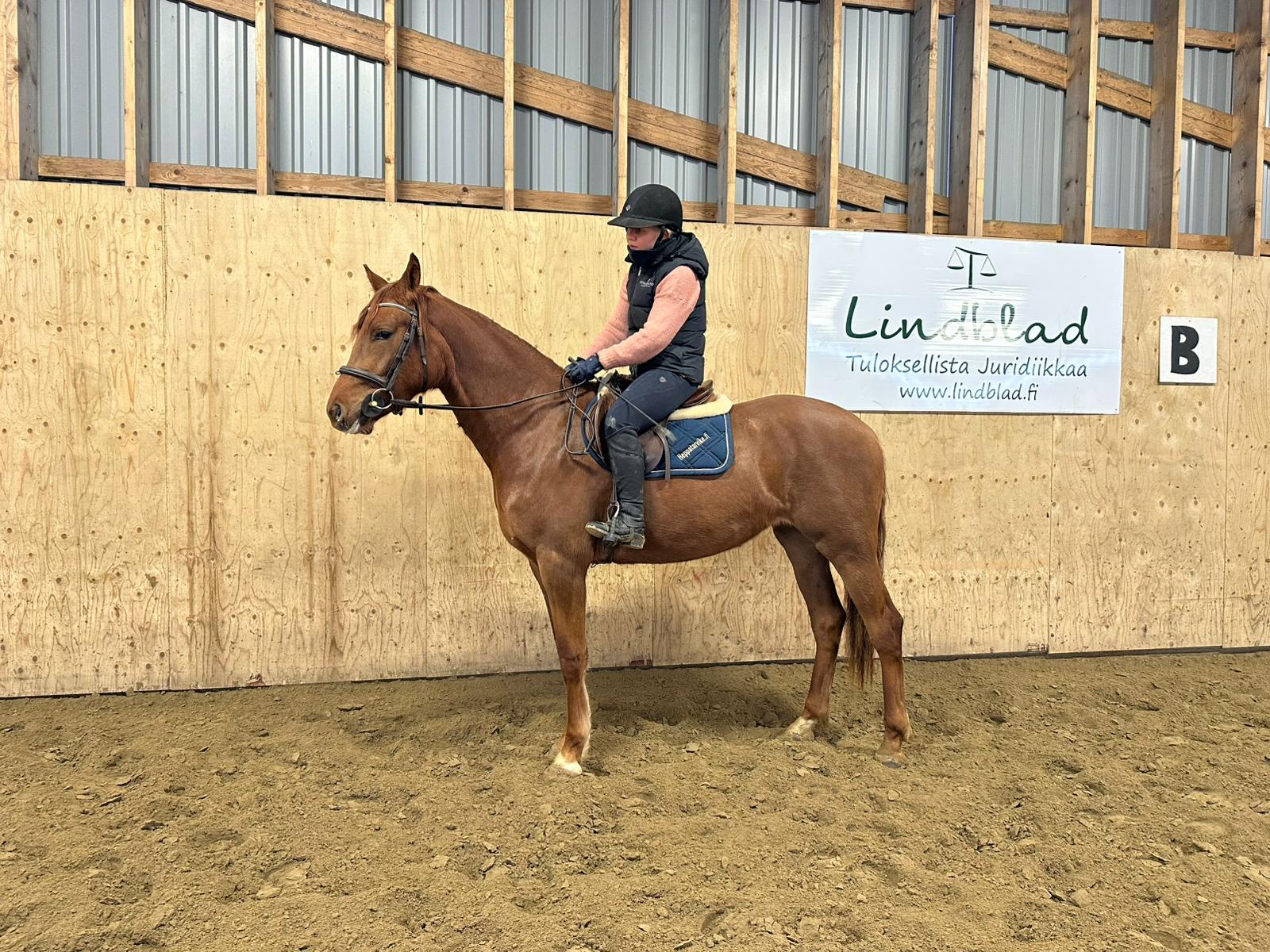 Peruskoulutettu tänä vuonna ratsuksi, entinen ravuri. Sujuu ratsastus kaikissa askellajeissa niin maneesissa/kentällä/maastossa. Tasainen ratsastaa, ei kuumu ratsastaessa kuten entiset ravurit usein.
